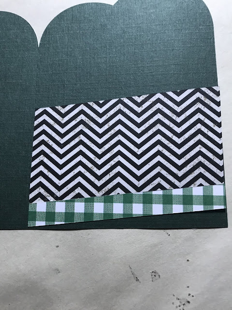 This was a fun card to make. As you can see, the layers from the bottom up are white, black, and red. Then there is a narrow strip of black and white polka dots, and on top of that is a green plaid.